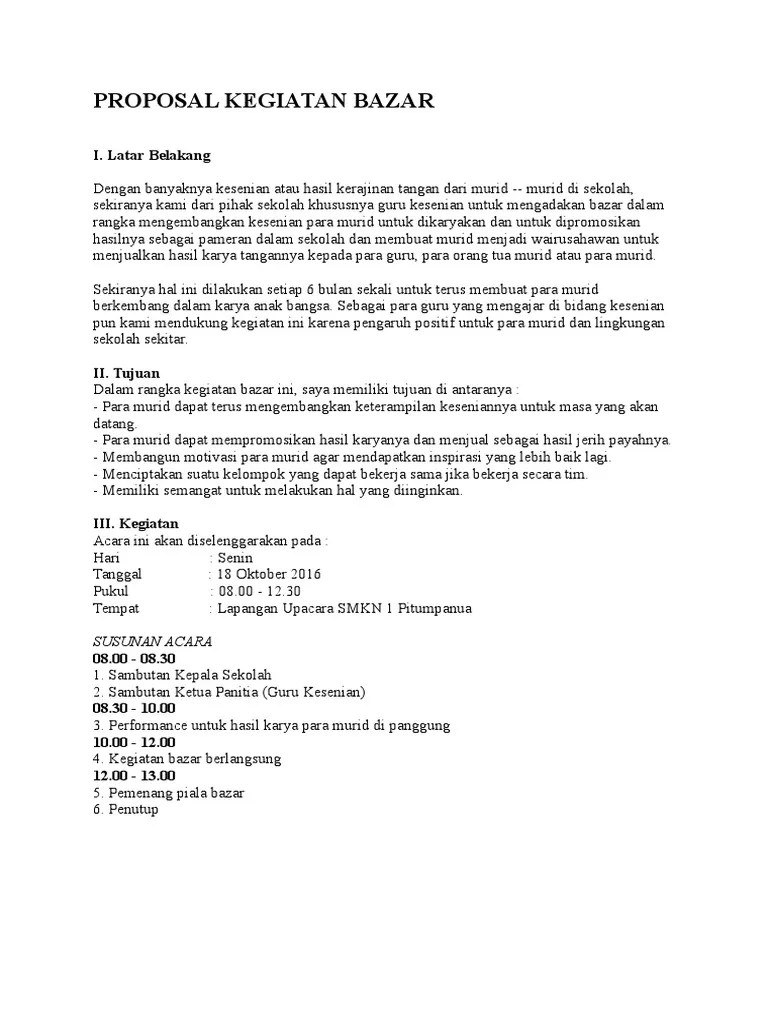 Mengumpulkan uang untuk menambah dana osis · 3. Bapak sebagai bahan pertimbangan, bersama ini kami lampirkan proposal kegiatan. Bentuk kegiatan bentuk kegiatan adalah peserta bazar akan membuka stand di gedung d selama 3 hari dan melakukan transaksi atau proses penjualan barang kepada . Semoga proposal ini dapat memberikan gambaran yang jelas mengenai kegiatan " "end sale " fashion bazaar & garage sale yang akan kami laksanakan. Melatih siswa(i) sma negeri 1 wangi . Sekiranya hal ini dilakukan setiap 6 bulan sekali untuk terus membuat para murid berkembang dalam karya anak bangsa. Oleh sebab itu, kami eskul kewirausahaan bermaksudmengadakan kegiatan bazar yang momennya berada di dalam nuansa semangat haripendidikan nasional yang jatuh . Latar belakang upaya peningkatan mutu pendidikan merupakan suatu kegiatan yang tidak pernah lepas dari perhatian kita semua, . Usaha dagang makanan, minuman dan februari 2014, proposal ini telah diverifikasi dan disetujui untuk dapat ditindak lanjuti pada kegiatan bazar . Contoh proposal kegiatan bazar ; Kegiatan tersebut merupakan kegiatan santunan dan bazar ramadhan desa. Merealisasikan program kerja osis periode 2017/2018 · 2. Pembukaan semua aktifitas kegiatan bazaar,pameran foto dan music.